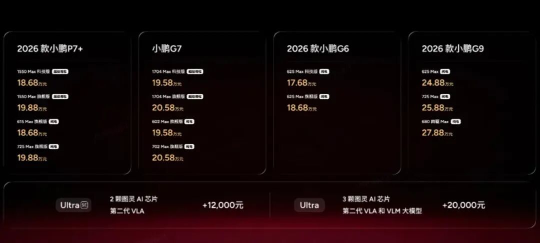 However, a closer examination reveals that all newly launched models are MAX versions. During the event, He Xiaopeng announced the rollout schedule for XPENG's second-generation VLA: In March, the initial batch will include the 2025 XPENG P7 Ultra, XPENG G7 Pure Electric Ultra, and XPENG X9 Super Extended-Range Ultra. Subsequent batches will introduce the 2026 XPENG P7+ Ultra/Ultra SE, 2026 XPENG G6 Ultra/Ultra SE, 2026 XPENG G9 Ultra/Ultra SE, and XPENG G7 Super Extended-Range Ultra/Ultra SE.