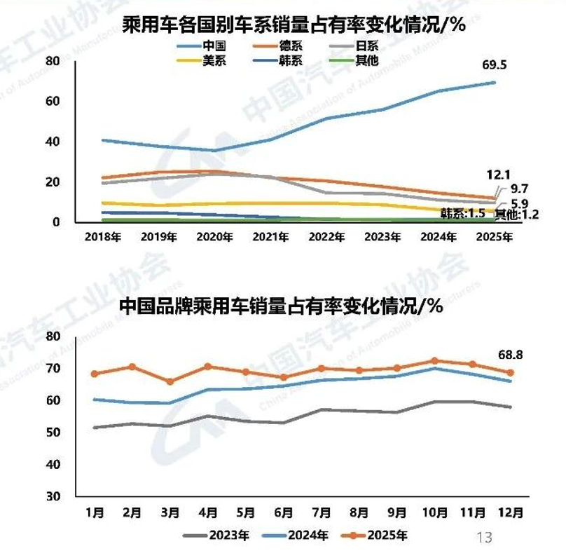 Data indicates that in 2025, domestic brand passenger vehicle sales reached 20.936 million units, up 16.5% year-on-year. More notably, domestic brands' market share climbed to 69.5%, a 4.3 percentage point increase from 2024. In stark contrast, domestic brands accounted for less than 30% of the market in 2012, while foreign brands held over 70%.