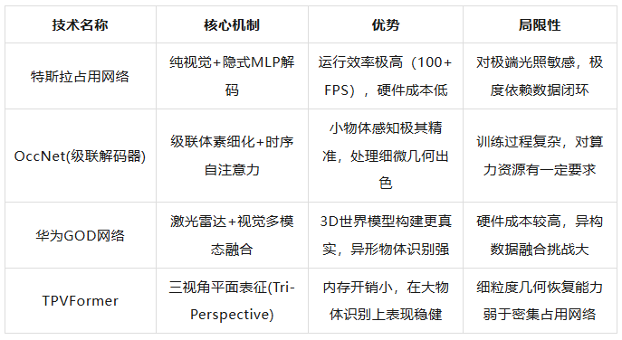 The following table compares the differences in the implementation paths of mainstream occupancy network technologies: