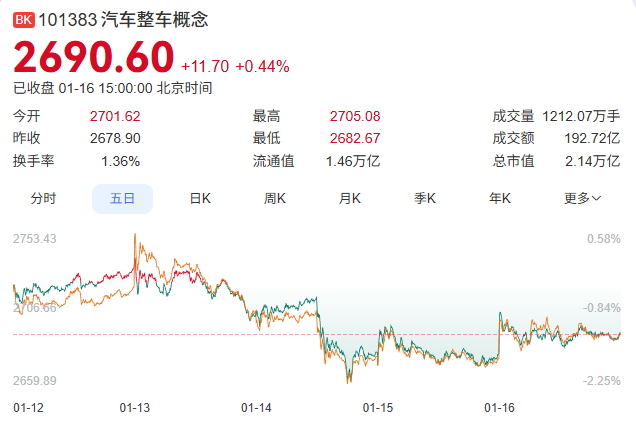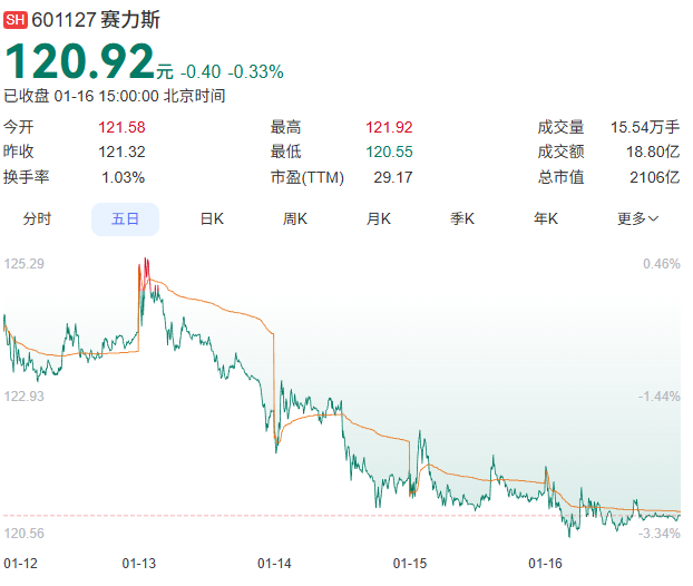 Seres, currently holding the highest stock price among automotive manufacturers, even experienced a continuous downward trend this week. On January 16, Seres fell by 0.33%, closing at 120.92 yuan per share with a trading volume of 1.88 billion yuan, a turnover rate of 1.03%, and a total market capitalization of 210.641 billion yuan.