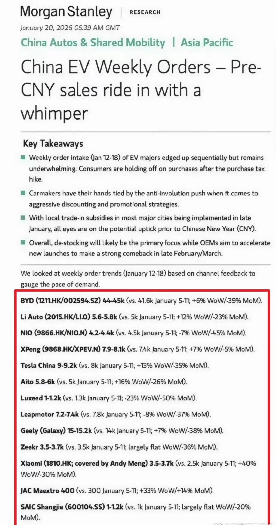 According to a Morgan Stanley report circulating online, the company has aggregated weekly order data for major domestic EV brands based on feedback from channels. During the third week of January (from the 12th to the 18th), the weekly order data for domestic EV manufacturers showed a slight week-on-week uptick, with only a handful of brands experiencing declines. Morgan Stanley deems the overall order performance as subpar, attributing it to consumers postponing their purchase plans following the reduction in vehicle purchase subsidies in 2026.