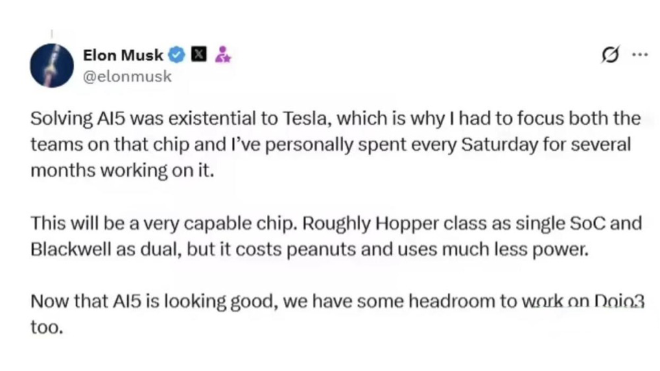 Shortly before the earnings release, Musk posted on social media that AI5's performance on a single SoC is comparable to NVIDIA's Hopper, while a dual-SoC configuration rivals NVIDIA's Blackwell, all at a lower cost and price.