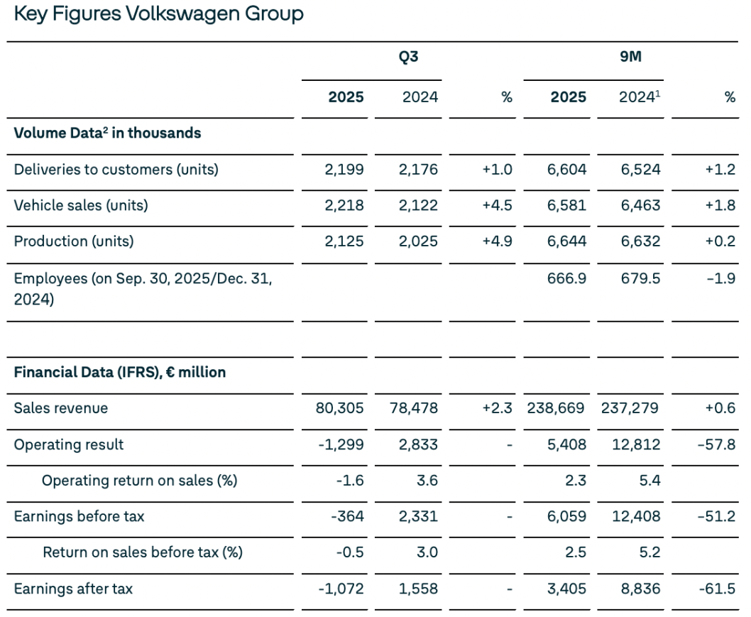 More severely, the net loss was 1.072 billion euros, compared to a net profit of 1.558 billion euros in the same period last year, a year-on-year decrease of approximately 168.8%. This was also Volkswagen's first quarterly loss in nearly five years. In the first three quarters of this year, Volkswagen Group's net profit decreased significantly by 61.5% year-on-year to 3.4 billion euros.