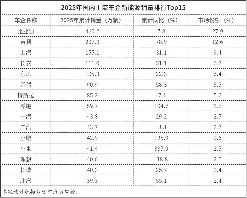In stark contrast to Xiaomi's explosive growth, Li Auto will sell 406,000 units in the full year, down 18.8% year-on-year, making it one of the few automakers in the top 15 to experience a year-on-year decline. The core reasons for the decline include lagging product iteration rhythms, with its existing extended-range electric vehicles facing fierce competition from similar products of domestic and joint venture brands, while its pure electric vehicle lineup was introduced relatively late, failing to promptly meet shifting market demands. Additionally, the growth of its focused mid-to-large SUV market has slowed, coupled with users' diversified choices in new energy vehicle powertrains, leading to market share dilution. Nevertheless, Li Auto will maintain a 2.5% market share with its precise positioning for family users, and the performance of its subsequent pure electric products may become key to reversing its declining trend.