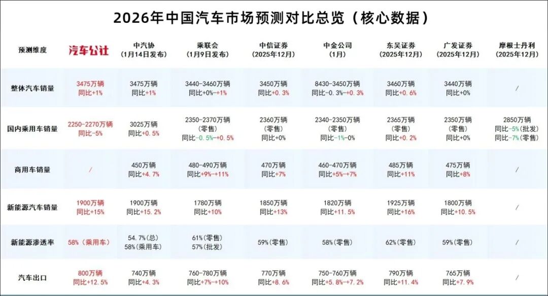 Both domestic official institutions and foreign authoritative research organizations have laid a solid foundation for the possibility of a market downturn in 2026. The most optimistic forecast from the China Passenger Car Association (CPCA) cautiously projects a mere 1% growth for the auto market in 2026, while the most pessimistic prediction suggests a 7% decline. The majority of forecasts indicate a negative growth range, with declines between 3% and 5%.