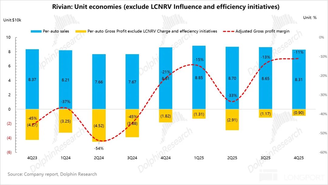 Vehicle gross margin continued to rise: Q4 vehicle gross margin was -7%, up 4.4 percentage points QoQ, or -11% excluding carbon credits, driven by lower per-unit variable costs (due to Rivian's ongoing cost reductions, weakened tariff impacts, and higher-margin EDV sales), offsetting the effects of lower ASPs and higher per-unit depreciation costs.