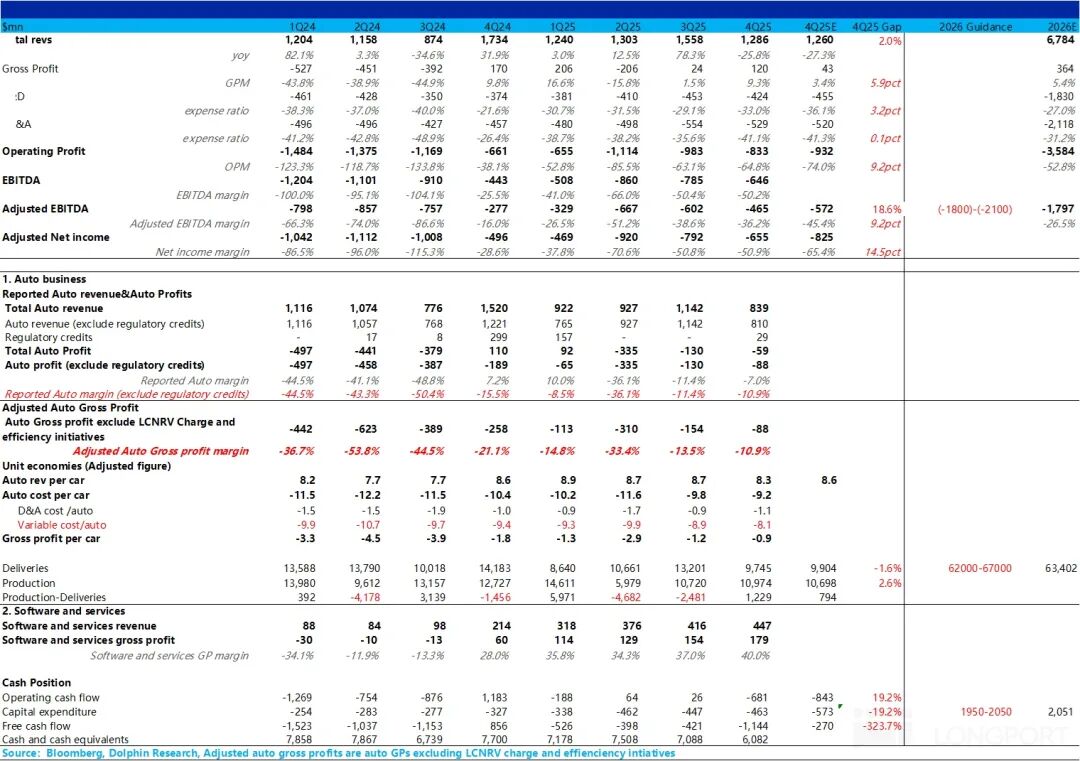 ② Adjusted EBITDA guidance of -$1.8 billion to -$2.1 billion (vs. -$2.06 billion in 2025): Below market expectations of -$1.8 billion, mainly due to prolonged R2 production ramp-up throughout 2026 and increased R&D investment in autonomous driving, diluting the profit improvement from sales growth.