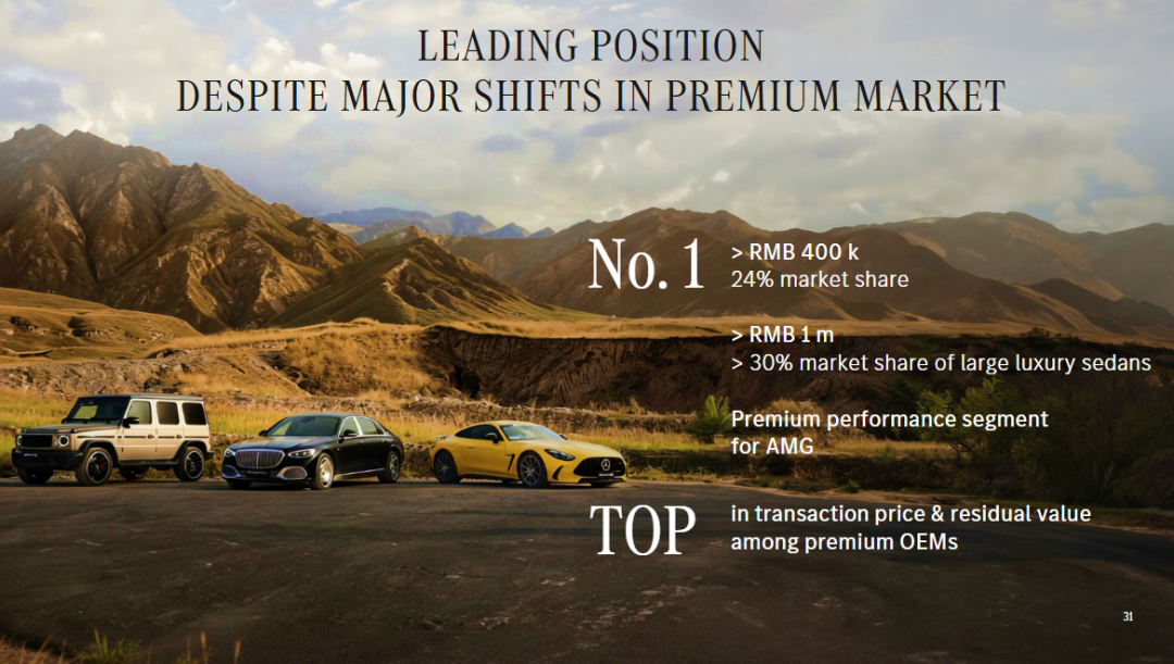 In the Chinese market, Mercedes-Benz provided a detailed interpretation of its updated China strategy. The company acknowledged that the landscape of China's luxury car market has undergone significant changes, yet from the perspective of the high-end luxury segment, Mercedes-Benz continues to hold a leading position. For instance, in the high-end market with prices exceeding RMB 400,000 in China, Mercedes-Benz commands a 24% market share, ranking first. In the ultra-luxury market with prices exceeding RMB 1 million, Mercedes-Benz's large luxury sedans boast a market share exceeding 30%. The AMG brand leads among luxury car companies in terms of transaction price and residual value in the luxury performance car market.