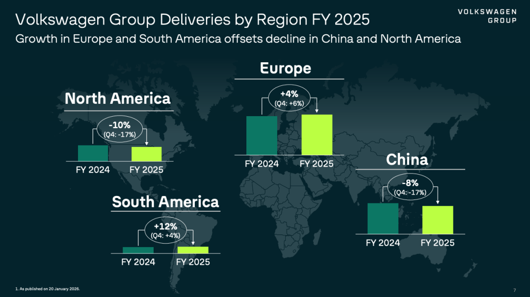 China: Continues to decline, down 8%, following a 10% drop last year. According to our previous article "The Resilience and Cost of Volkswagen Group's Global and Chinese Performance in 2025," Volkswagen Group sold 2.69 million vehicles in China in 2025.