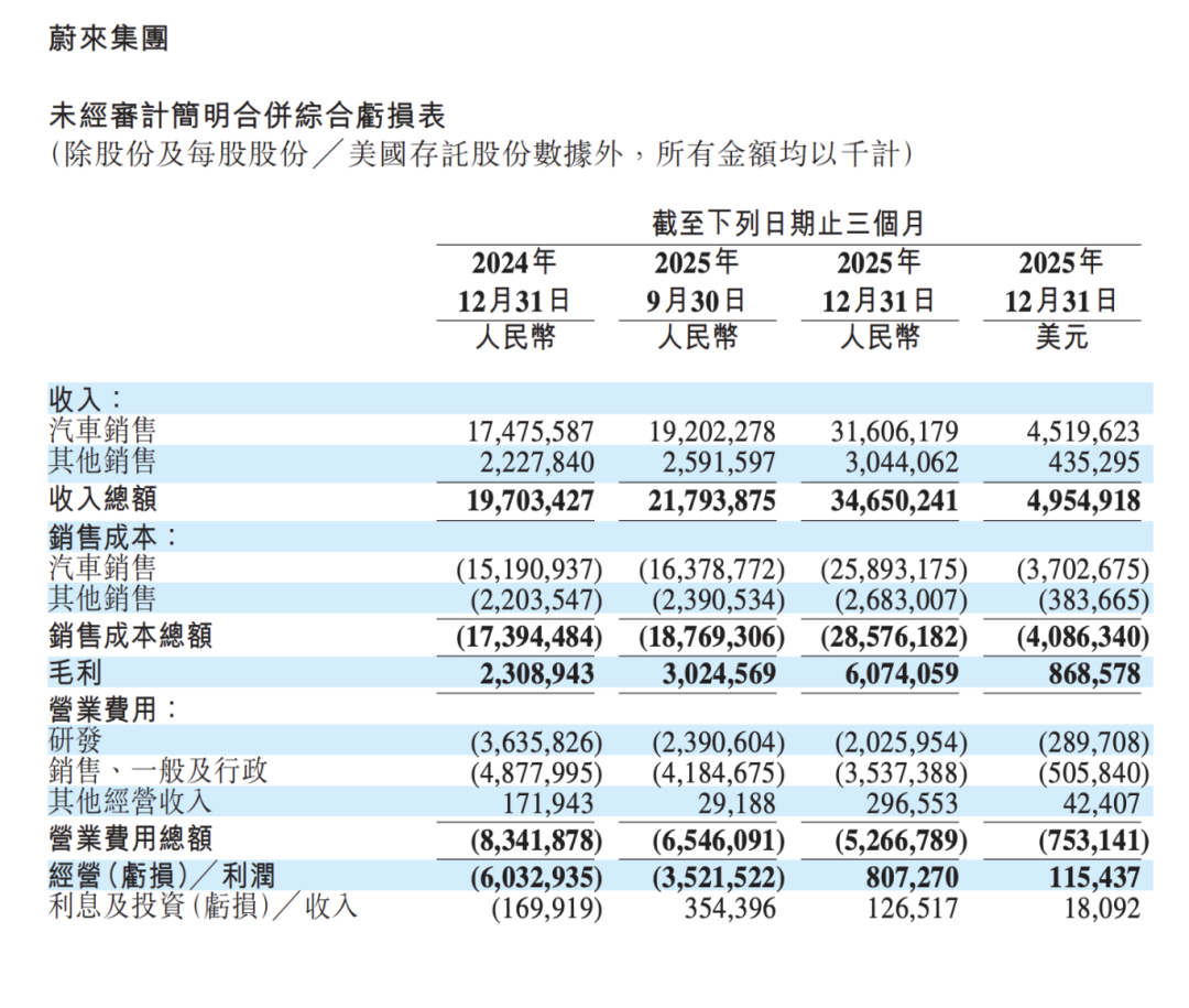 The earnings report showed that in the fourth quarter of 2025, NIO achieved an operating profit of RMB 807 million and a net profit of RMB 283 million—its first single-quarter profit in 11 years of operation.