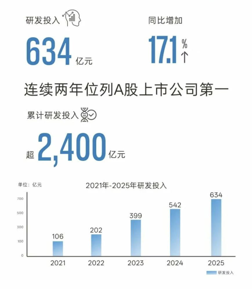 Another highlight of BYD's 2025 financials is its R&D spending, which once again topped A-shares. In 2025, R&D investment reached RMB 63.4 billion, up 17.1% year-on-year, ranking first among A-share listed companies for the second consecutive year, with cumulative R&D spending exceeding RMB 240 billion.
