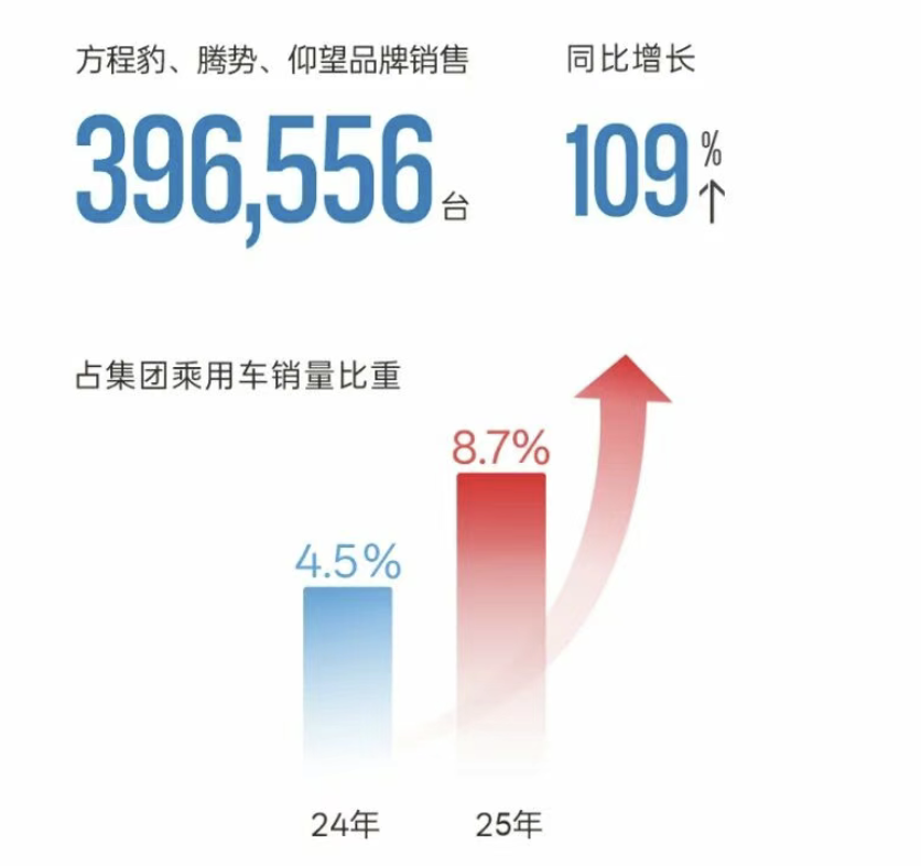 Technological investments have also driven BYD's progress in the mid-to-high-end passenger vehicle market. Its three mid-to-high-end brands—Fangchengbao, Denza, and Yangwang—sold approximately 400,000 units in 2025, up 109% year-on-year, accounting for 8.7% of BYD Group's passenger vehicle sales, doubling from 4.5% in 2024.