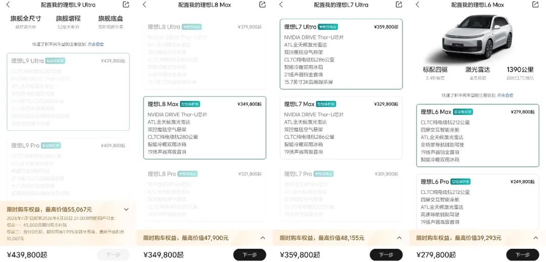 Currently, the existing Li Auto L9 is no longer available for orders, likely discontinued. The L7 and L8 are mostly clearing inventory, with only select configurations remaining. The L6 remains fully available.