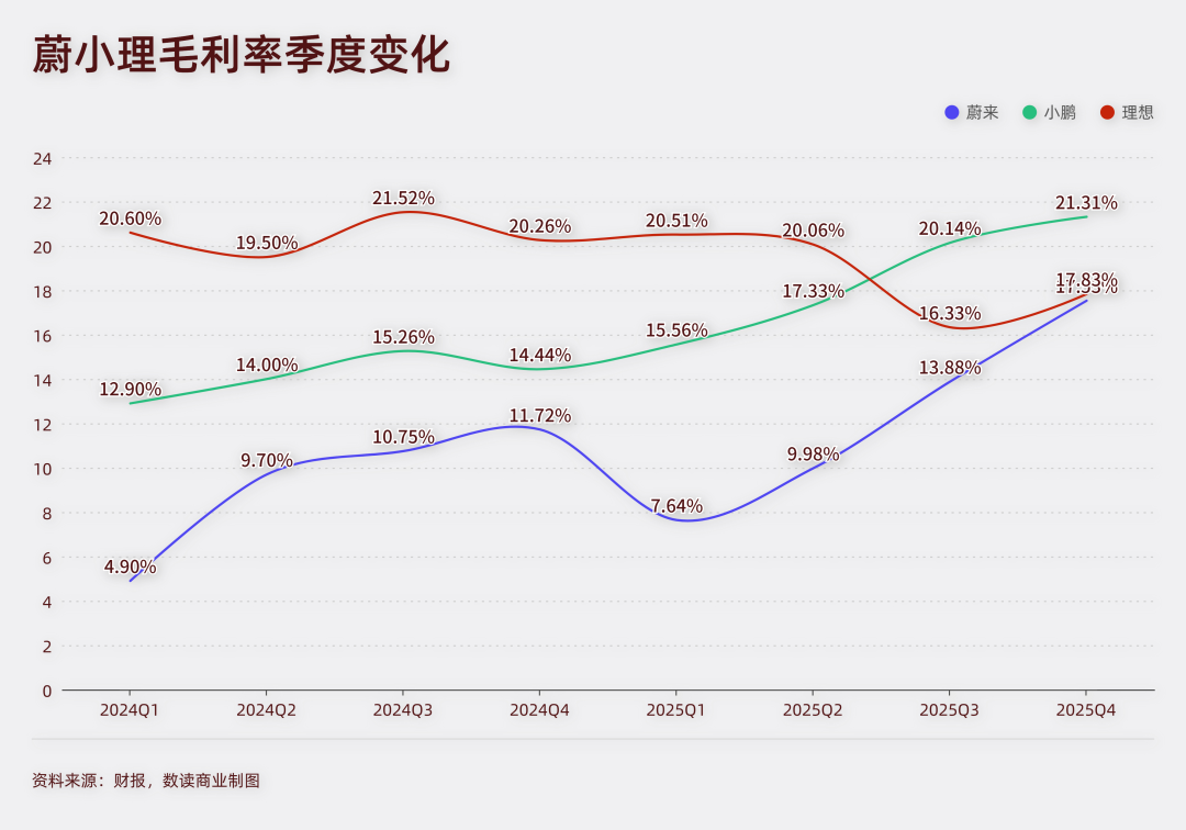 In 2025, LI Auto's gross margin fell below the 20% threshold for two consecutive quarters, a red line that founder Li Xiang had previously valued greatly. In contrast, XPENG broke through the 20% threshold for two consecutive quarters, and NIO also surged, nearly matching LI Auto in the fourth quarter.
