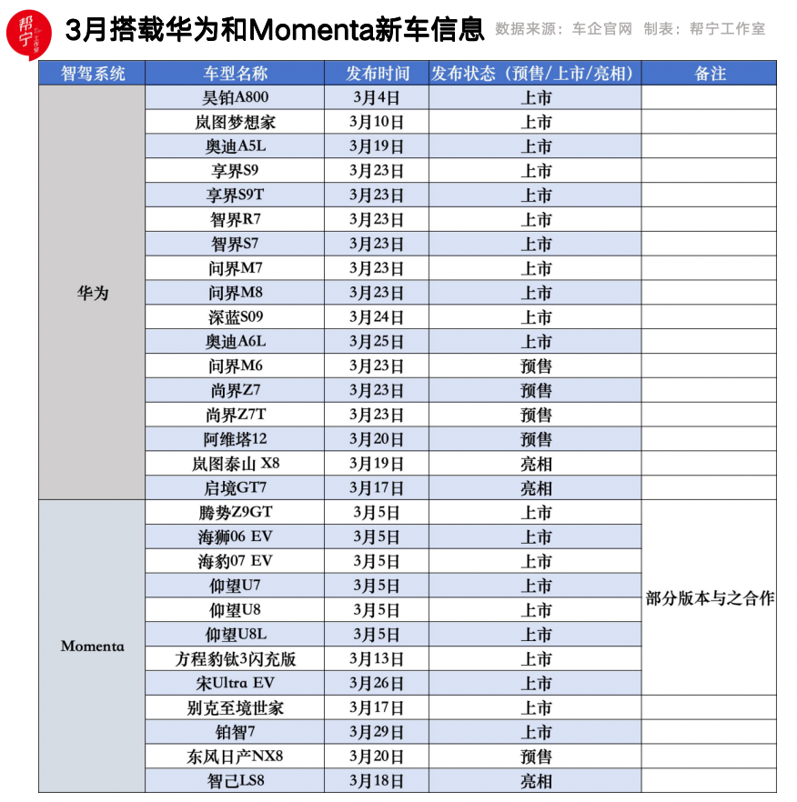 "Nearly 80 new cars launched in March, 17 with Huawei Qiankun, 12 with Momenta"