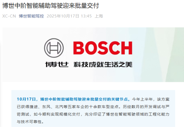 In October 2025, Bosch's mid-level intelligent driving solution was adopted in over ten models from five automakers, including JETOUR, Dongfeng, and BAIC.