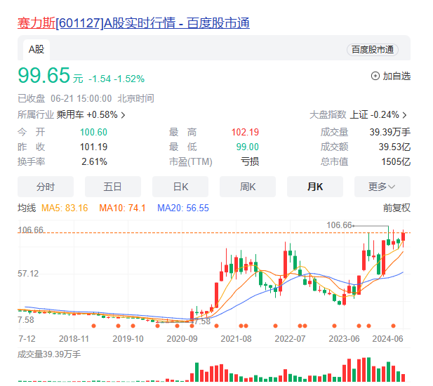 Until the Huawei autumn new product launch event in September 2023, Yu Chengdong made a comeback with the all-new Wenjie M7, while at that time, the tremendous potential of Huawei chips breaking through technological blockades, accompanied by national sentiment, once again surged towards Celes. The stock price of Salis rose directly from 35 yuan per share to 100 yuan per share.