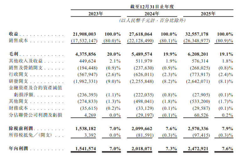 The prospectus reveals that from 2023 to 2025, Desay SV's revenue surged from 21.908 billion yuan to 32.557 billion yuan, representing a cumulative increase of 48.6% over three years, with a compound annual growth rate of 21.9%. Net profit during the same period rose from 1.542 billion yuan to 2.473 billion yuan, totaling 6.033 billion yuan in net earnings over three years. The net profit margin increased slightly from 7.0% to 7.6%, indicating limited improvement in profitability.