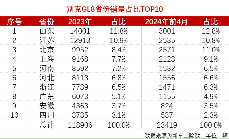 From a national perspective, coastal provinces like Shandong, Jiangsu, Beijing, and Shanghai are the key sales regions for Buick GL8, with the top five provinces accounting for roughly half of its sales. However, according to insurance data from 2023 and the first four months of this year, Buick GL8, squeezed by competition from other MPVs, has almost been pushed towards Shandong, Beijing, and Shanghai, with sales in other provinces declining across the board.