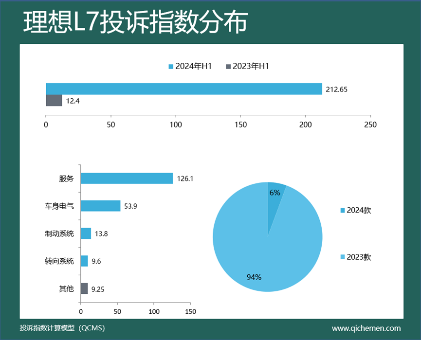 Automotive Quality Complaint Review: The luxury mid-to-large SUV Lixiang L7 received a complaint index of 212.65 in the first half of the year, up 1614.92% year-on-year. Price reductions were the reason for widespread complaints from Lixiang L7 owners. On April 22, the official announced a 20,000 yuan price reduction for the Lixiang L7, with a new starting price of 301,800 yuan. News of the price reduction immediately caused dissatisfaction among existing owners. In response, Lixiang Auto formulated a compensation plan: for owners who had purchased and taken delivery of the 2024 model of the Lixiang L7, they would be compensated in cash for the price difference. However, the compensation plan had limited coverage, and for old owners who purchased Lixiang vehicles before 2024, Lixiang Auto did not specify a specific compensation plan. As a result, pre-2024 Lixiang owners pointed out that Lixiang Auto seriously discriminates against its customers.