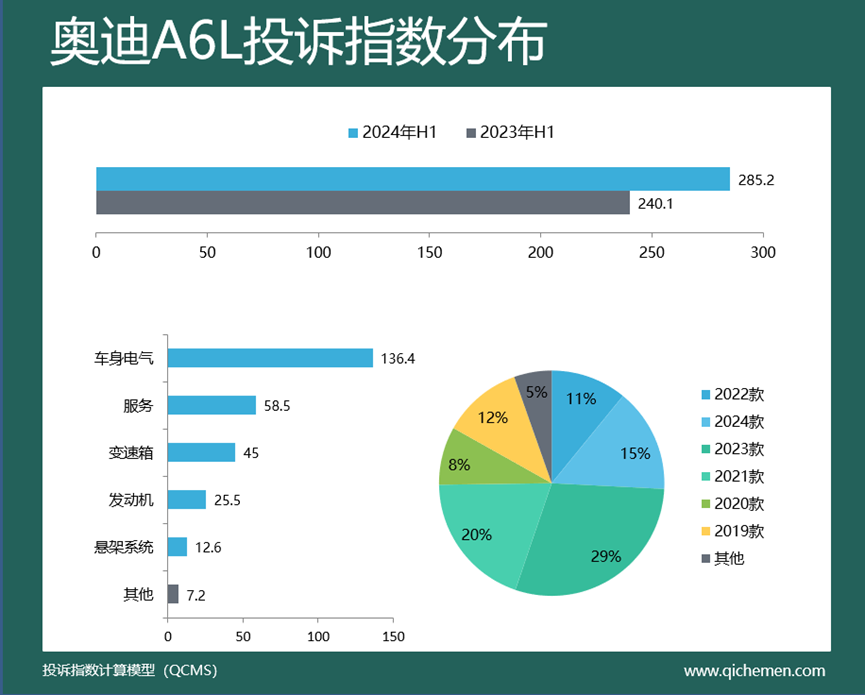 Automotive Quality Complaint Review: From January to June, the complaint index of the Audi A6L was 285.2, up 18.78% year-on-year, ranking seventh. Fuel tank sensor failures and black screens on the dashboard were the main complaints about the Audi A6L. Owners reported that their Audi A6Ls suddenly displayed fuel tank malfunctions on the computer and showed the lowest fuel level on the dashboard when driving 50,000 kilometers, affecting driving safety. Other owners complained that the dashboard suddenly went black during driving, followed by the illumination of fault lights. Although the dashboard lit up again after parking and locking the doors for 15 minutes and restarting, more fault lights appeared. Owners believed it was a quality issue and demanded a free replacement of the dashboard.