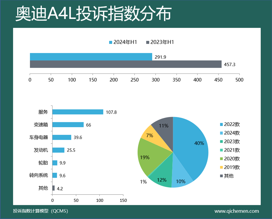 Automotive Quality Complaint Review: The complaint index of the Audi A4L in the first half of the year was 291.9, down 36.17% year-on-year. From the complaint feedback, the recurring issues of sunroof leaks and abnormal noises from the transmission became major points of criticism, with the 2019 and 2020 models being the most typical.