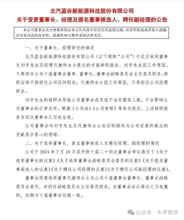 More importantly, on the evening of July 19, BAIC BluePark also underwent significant personnel changes, with Chairman Liu Yu resigning due to work reasons and no longer serving as a director or chairman of the company.