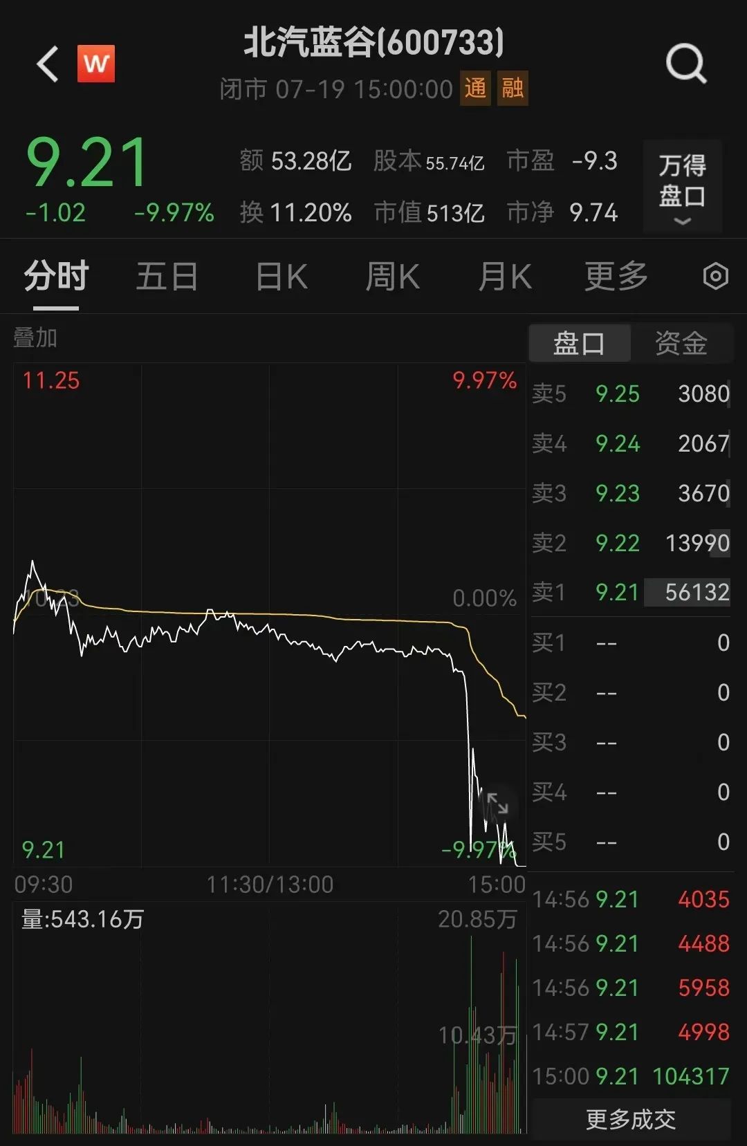 Especially near the close at 15:00 in the afternoon, BAIC BluePark experienced a direct flash crash, closing at 9.21 yuan per share, with a decline of 9.97%.