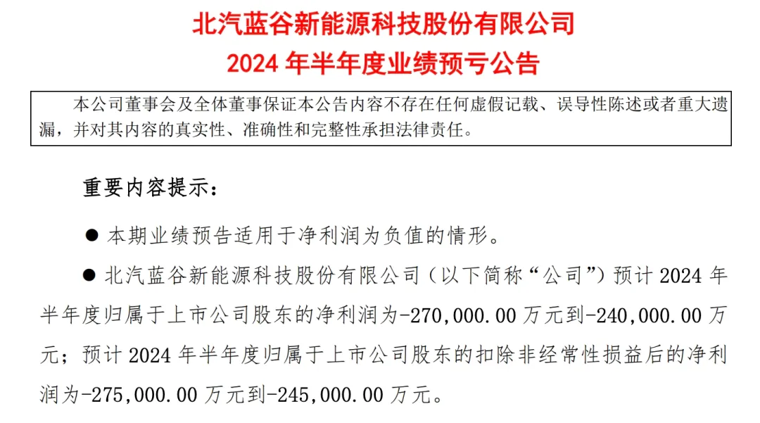 According to the forecast, BAIC BluePark's net loss for the first half of 2024 was 2.4 billion to 2.7 billion yuan, compared to a loss of 1.98 billion yuan in the same period last year.