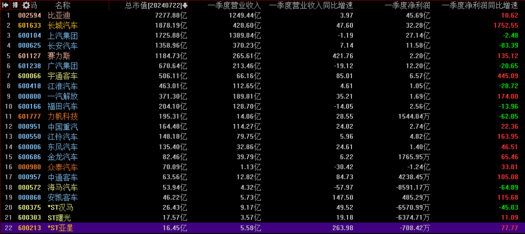 Foton, GAC, and SAIC all saw year-on-year declines in both revenue and net profit growth, while BYD, which reduced the price of the Qin model to five digits, achieved a resonance increase in both revenue and net profit. An important factor is that BYD has integrated its supply chain to the utmost extent and is the first automaker globally to achieve independent production of the "three-electric system." As of July 22, 2024, BYD also has the highest total market value among automakers, reaching 727.788 billion yuan, far ahead of the second-placed Great Wall Motor and third-placed SAIC Motor.