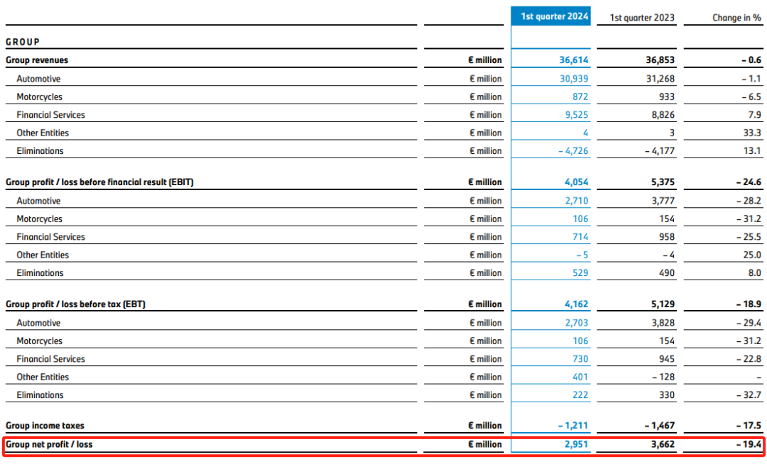 Meanwhile, the practice of trading price for volume has eroded BMW Group's overall profitability. The company's pre-tax profit in 2023 was 17.096 billion euros, a year-on-year decrease of 27.3%; the EBIT margin for its core automotive business was 9.8%, below market forecasts of 9.9%; and net profit in the first quarter also declined by 19.4%.