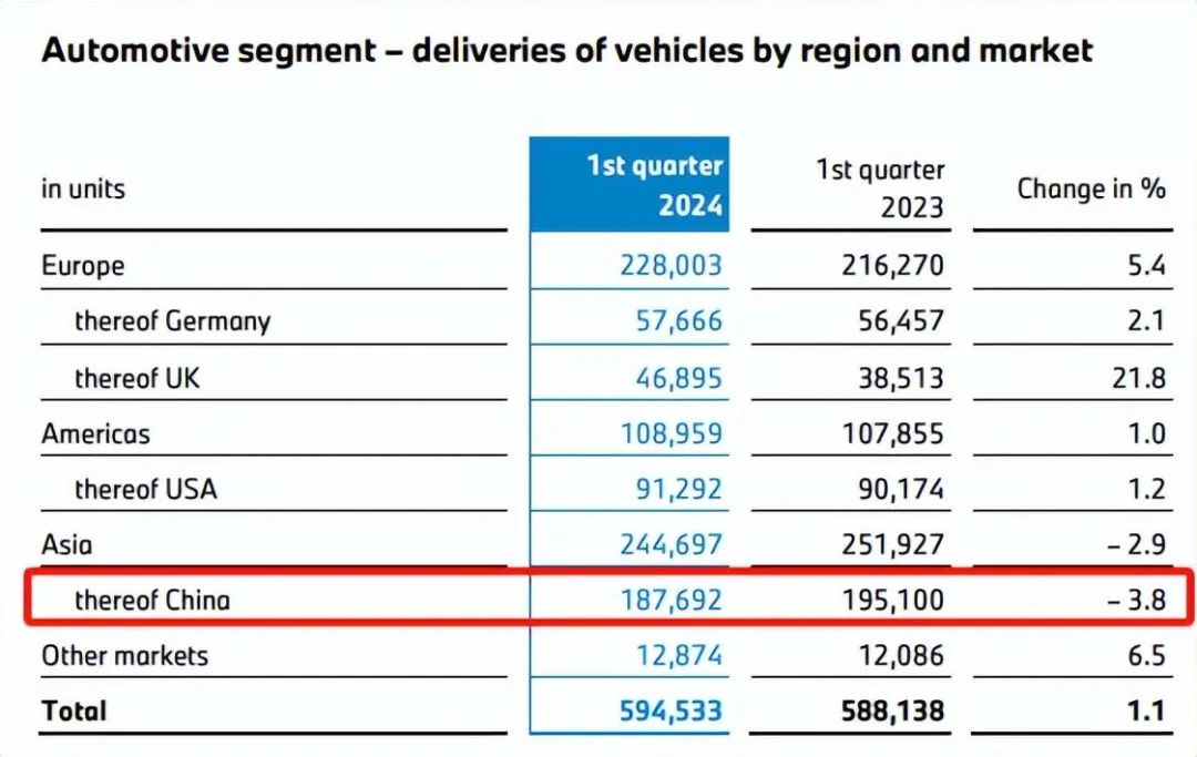 Dividing the delivery numbers by region reveals that among BMW Group's various submarkets worldwide, only the Chinese market experienced a reduction in car sales, falling from 195,100 units in the first quarter of 2023 to 187,700 units in the same period of 2024, a year-on-year decline of approximately 3.8%.