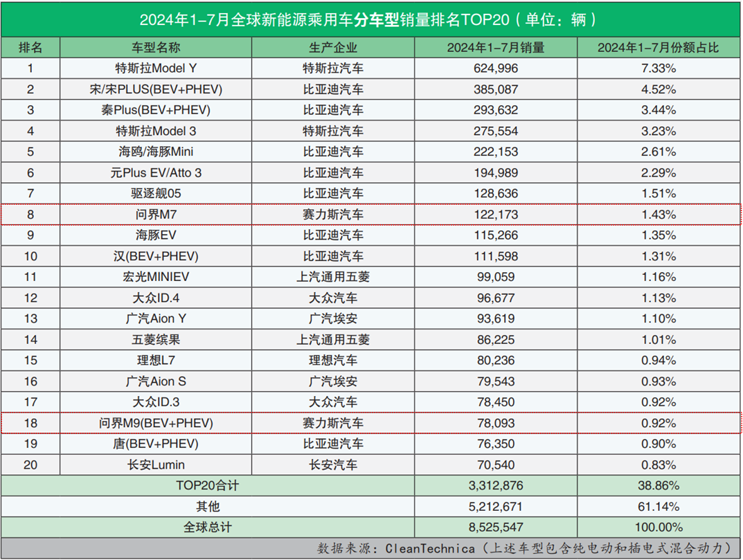 It is noteworthy that Wenjie's sales performance ranks highly not only domestically but also globally. According to CleanTechnica, from January to July 2024, Wenjie ranked seventh among global new energy passenger vehicle manufacturers, trailing only BMW and Volkswagen but surpassing multinational automakers like Mercedes-Benz and Volvo. Model-wise, both Wenjie M7 and Wenjie M9 made it to the top 20 global new energy vehicle sales list for the period, with Wenjie M7 even entering the top 10. Its future competition with Tesla's Model Y remains to be seen.