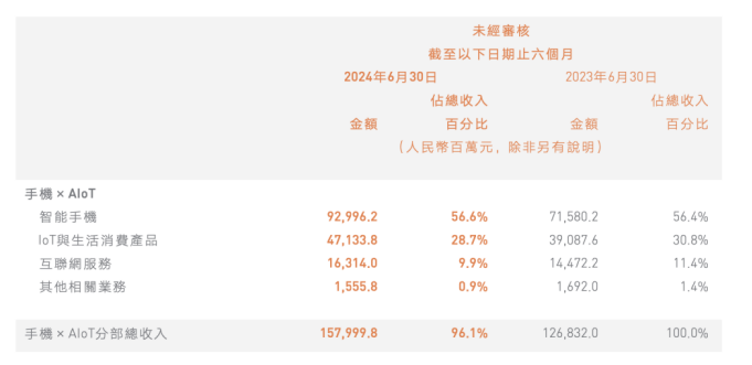 Currently, mobile phones remain the pillar business of Xiaomi Group, accounting for over 50% of revenue. In the first half of 2024, Xiaomi Group's smartphone business generated revenue of RMB 93 billion, with global shipments reaching 82.8 million units, both achieving varying degrees of growth.