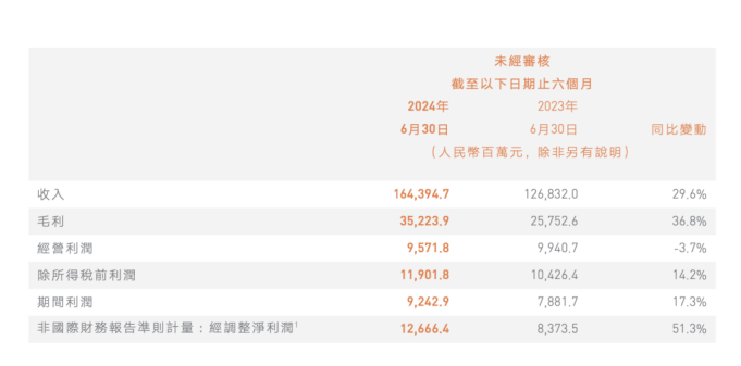 According to the 2024 interim report, Xiaomi Group's revenue for the first half of the year was RMB 164.395 billion, an increase of 29.6% year-on-year; profit during the period was RMB 9.243 billion, an increase of 17.3% year-on-year, achieving growth in both revenue and profit.