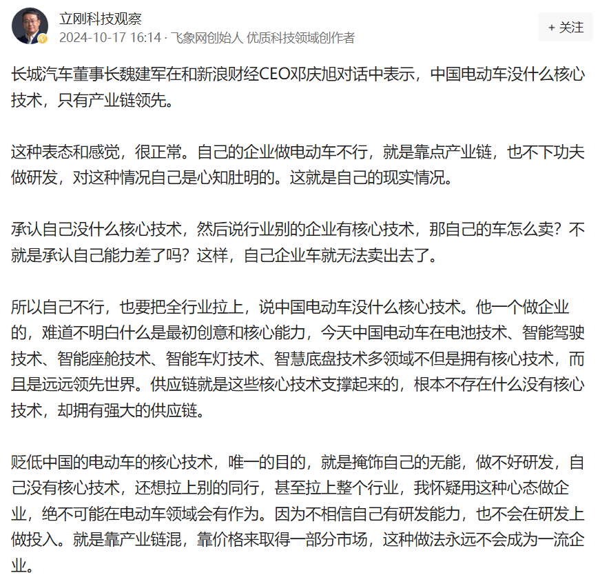 However, in a recent conversation with Sina Finance CEO Deng Qingxu, Wei Jianjun, Chairman of Great Wall Motor, bluntly stated, "China's electric vehicles have no core technology, only a leading industrial chain, especially in batteries and algorithms." Regarding the electrification of overseas brands, he believes that overseas brands "not only have the technology, but lack an electrification strategy."
