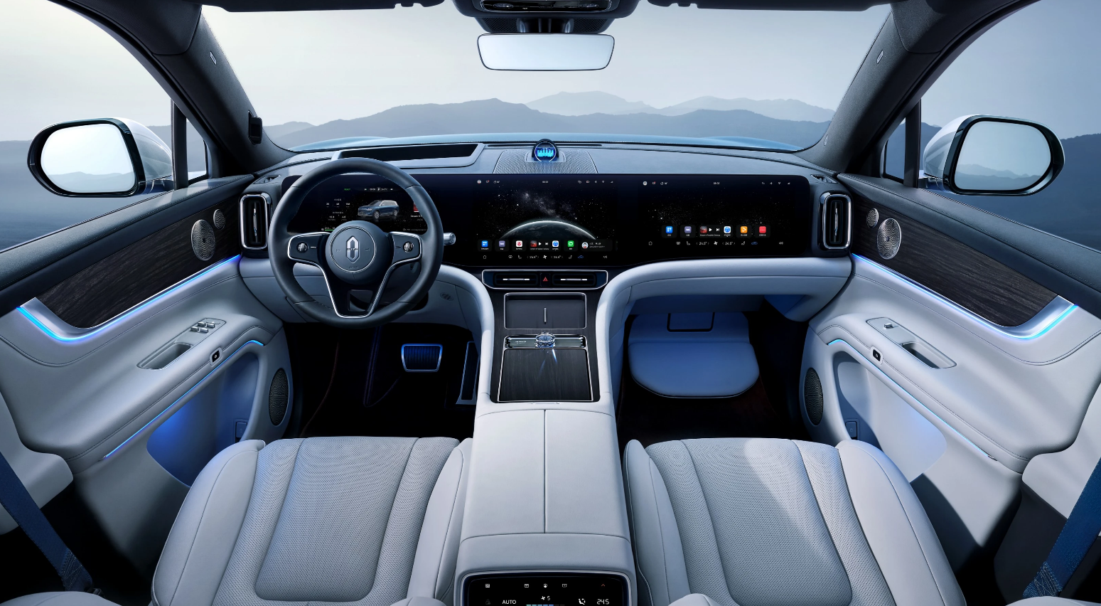 The Ask M8's interior adopts a triple-screen design similar to the Ask M9, with narrower black borders for a more technological aesthetic. Other notable details include a hollowed-out central armrest for increased storage space and sloped door armrests instead of horizontal ones, which expand the horizontal interior space.