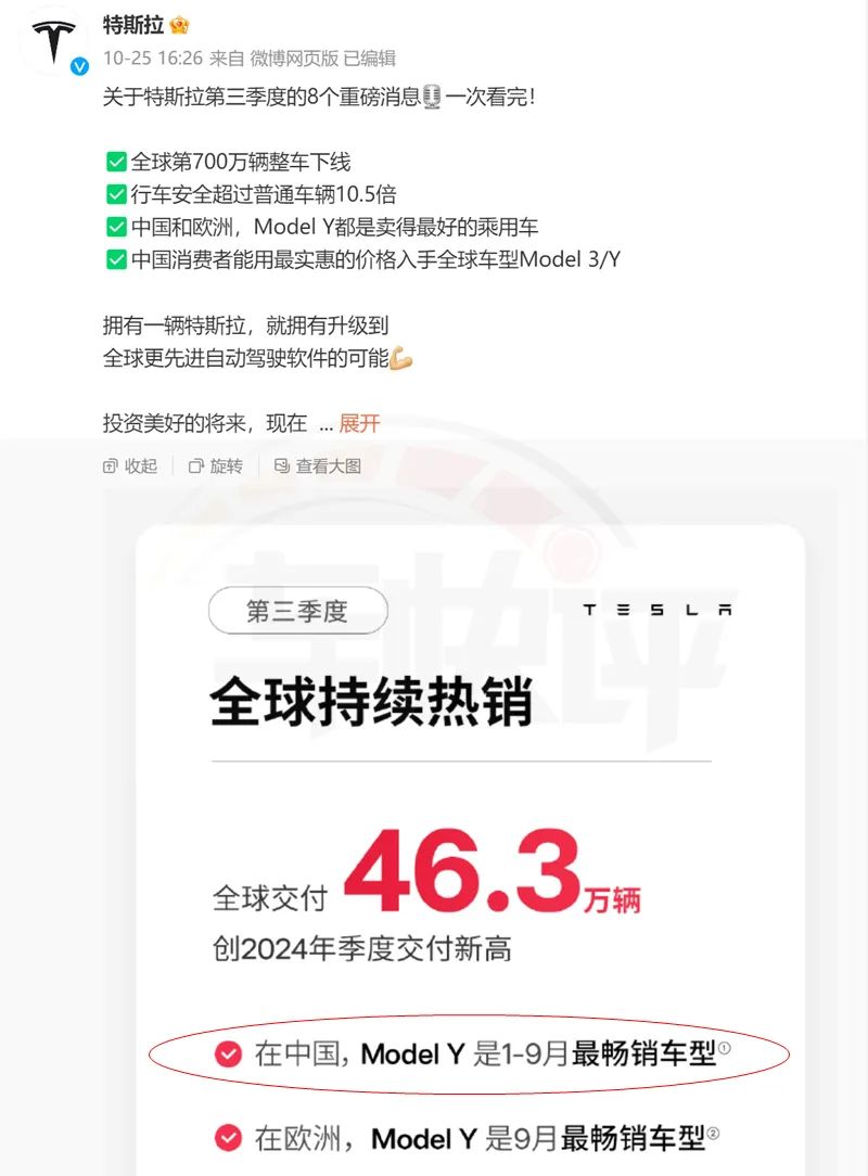 In addition, Tesla specifically emphasized that the Tesla Model Y was the best-selling model in China from January to September and the best-selling model in Europe in September.