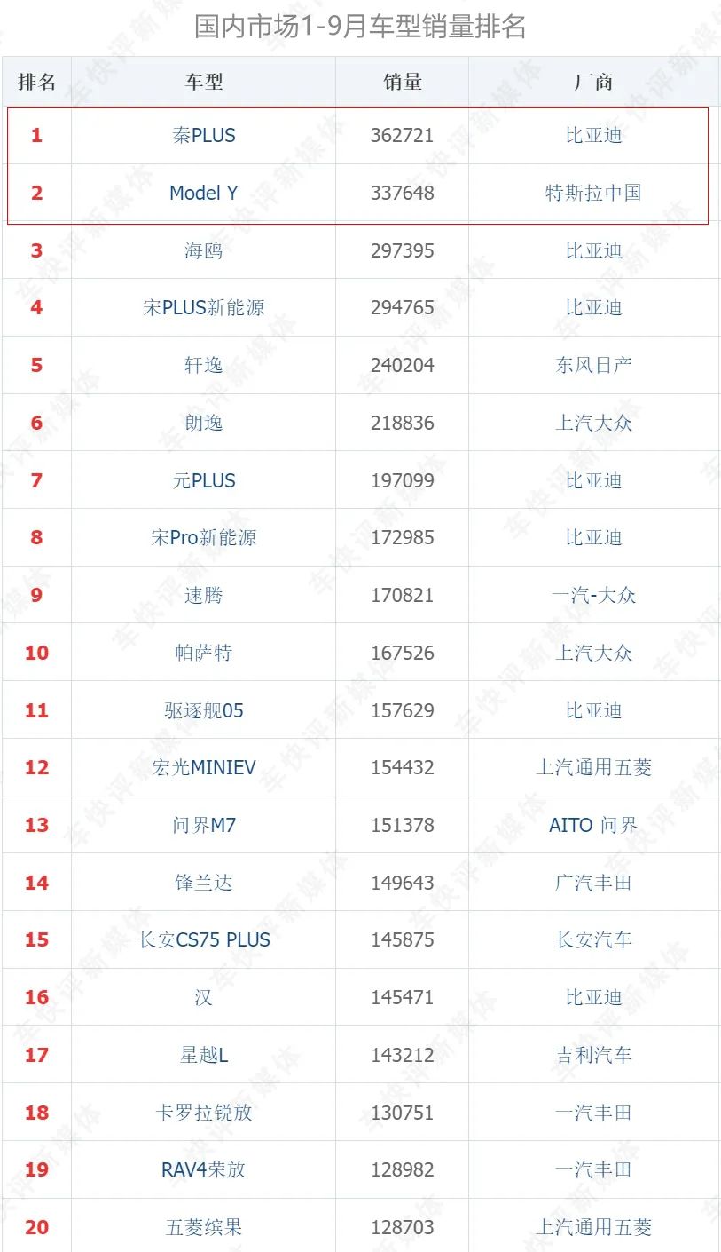 After specifically checking the sales data of domestic car models from January to September, CarQuickRating found that the best-selling model in China is actually the BYD Qin PLUS, with cumulative sales of 363,000 units. The Tesla Model Y comes in second with sales of 338,000 units.