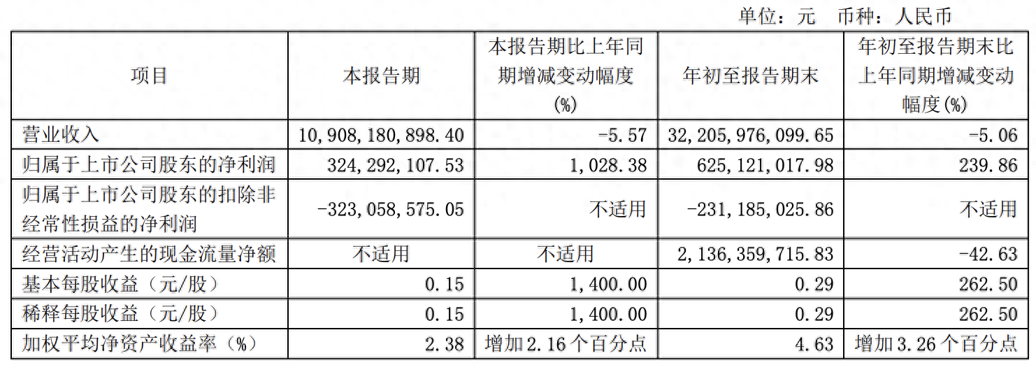 The financial report showed that the company achieved operating revenue of 32.206 billion yuan in the first three quarters, a year-on-year decrease of 5.06%; net profit was 625 million yuan, a year-on-year increase of 239.86%.
