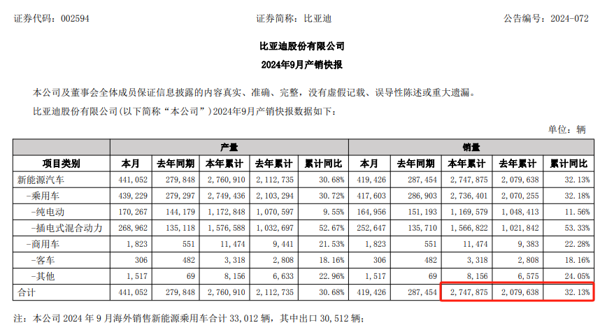 In the first nine months of this year, BYD sold a total of 2.7479 million new energy vehicles, a year-on-year increase of 32.13%. BYD's annual sales target for this year is 3.6 million vehicles. In the first nine months of this year, 76.33% of the annual sales target has been achieved. In the fourth quarter, an average of 284,000 new vehicles need to be sold each month. Based on BYD's current sales situation, this is relatively easy to achieve.