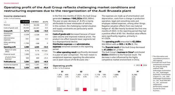 In the third quarter, the Audi Group delivered a total of 407,390 vehicles, a year-on-year decrease of 16%. Revenue was €15.322 billion, a year-on-year decrease of 5.5%. From January to September this year, Audi's revenue was €46.262 billion, a year-on-year decrease of 8.2%. The operating revenue of the Audi brand from January to September was €41.296 billion.
