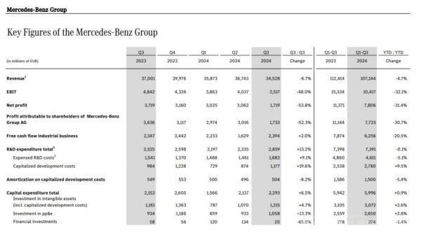 Mercedes-Benz's revenue for the third quarter was €34.528 billion, a year-on-year decrease of 6.7%. From January to September this year, Mercedes-Benz's revenue was €107.144 billion, a year-on-year decrease of 4.7%. Among them, passenger car revenue was €25.602 billion, a year-on-year decrease of 5.6%; from January to September, Mercedes-Benz passenger car revenue was €78.485 billion, a year-on-year decrease of 5.7%.