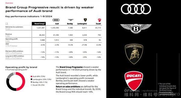 In terms of return on sales, the Audi Group was at 4.5% from January to September this year, compared to 9.1% in the same period last year, a decrease of 4.6 percentage points. As the core Audi brand, its operating revenue from January to September was €41.296 billion, with an operating profit of €1.012 billion and a return on sales of 2.5%, the lowest among the Audi Group. Bentley was at 15.5%, Lamborghini at 27.9%, and Ducati at 12% for the first three quarters of this year.