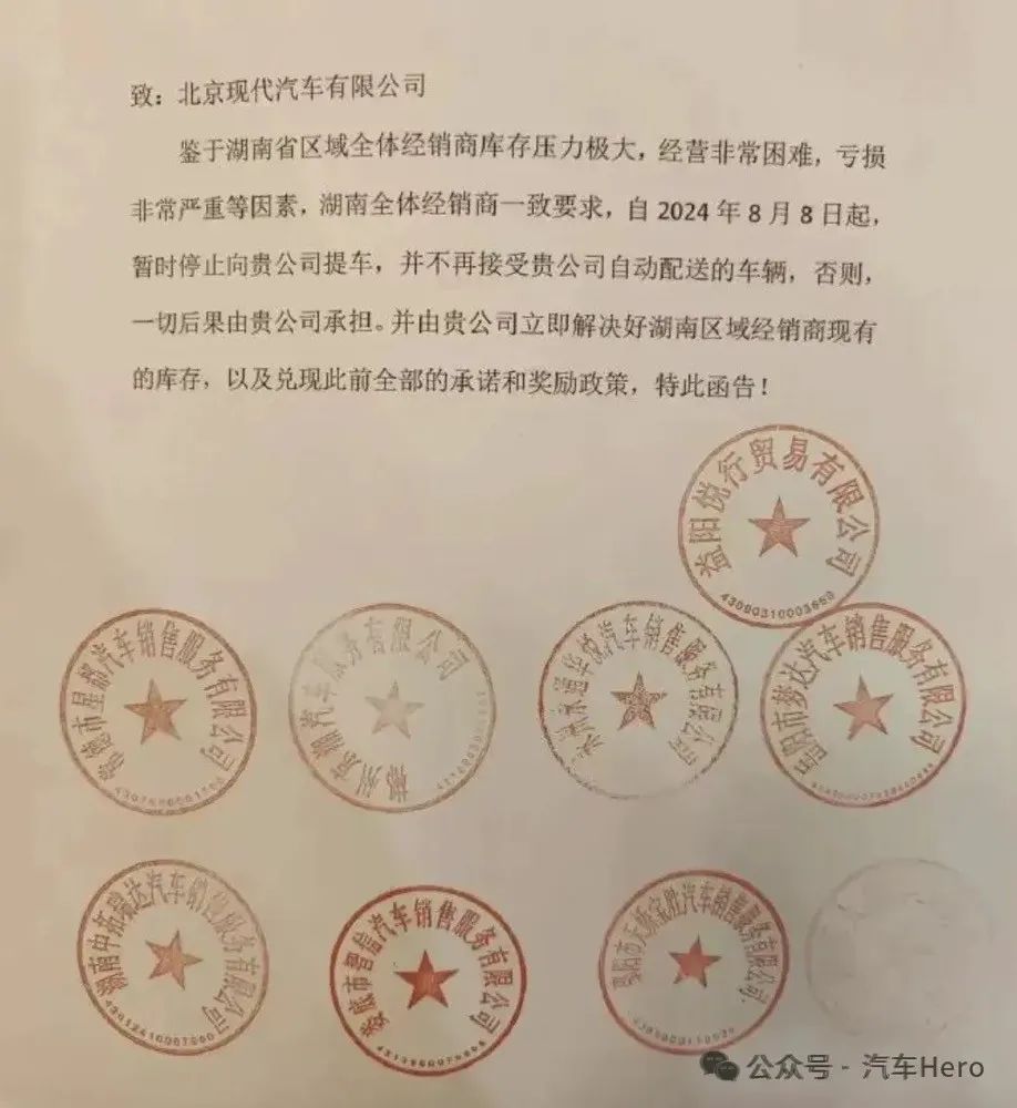 Some dealers have even bluntly stated: "Given the extreme inventory pressure faced by all dealers in Hunan Province, the difficult operating conditions, and the severe losses, all dealers in Hunan unanimously request that vehicle deliveries from your company be temporarily suspended starting from August 8, 2024, and that we will no longer accept vehicles automatically distributed by your company." Theoretically speaking, if it has come to the point of issuing an official letter with a seal, it is basically not false, which proves that Beijing Hyundai has entered the third stage of its brand's decline: the manufacturer's inventory sales projections have collapsed, and desperate dealers are frantically demanding the return of previously promised rebates. It is evident that Beijing Hyundai is currently under not only sales pressure but also significant inventory pressure. Amid the fierce competition in the automotive industry, Beijing Hyundai is the only joint venture automaker that has publicly clashed with its dealers.