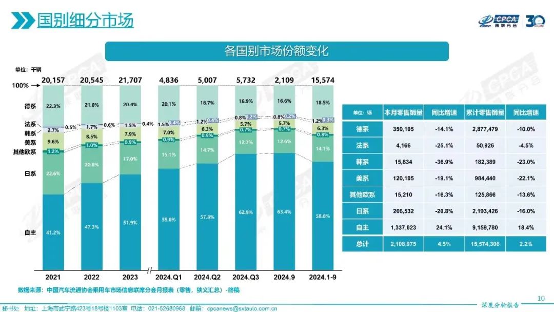 In the first three quarters of 2024, domestic passenger vehicle (excluding imports) retail sales increased by 2.2% year-on-year to 15.574 million units, with local brands achieving a growth rate of 18.4% and a market share of 58.8% at 9.16 million units.