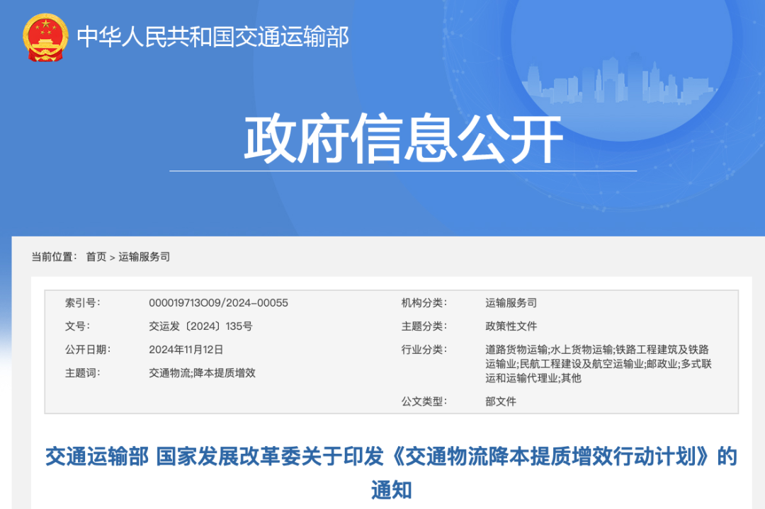 Guided by Xi Jinping Thought on Socialism with Chinese Characteristics for a New Era, this action plan comprehensively implements the spirit of the 20th National Congress of the Communist Party of China and the Second and Third Plenary Sessions of the 20th Central Committee, fully and accurately implements the new development concept, adheres to systematic planning, focuses on policy implementation, prioritizes the market, is guided by the government, is goal-oriented, is problem-oriented, progresses steadily, strives for practical results, and accelerates the structural, systematic, institutional, technical, comprehensive, and operational cost reduction, quality improvement, and efficiency enhancement in transportation and logistics to better serve the high-quality development of the economy and society. By 2027, significant achievements should be made in reducing costs, improving quality, and enhancing efficiency in transportation and logistics, and the ratio of total social logistics costs to GDP should strive to be reduced to approximately 13.5%. The main framework of the national comprehensive three-dimensional transportation network should be further improved, the infrastructure networking, supplementation, and chain strengthening should be promoted in depth, the transportation structure should be continuously optimized, the national railway freight turnover should increase by about 10% compared to 2023, the port container rail-water intermodal volume should increase by an average of about 15% annually, major breakthroughs should be made in the reform of the integrated transportation system, the "one-bill system" and "one-box system" for multimodal transportation should be accelerated, freight organization efficiency should be significantly improved, a batch of leading enterprises with international competitiveness should be cultivated, and the supporting role of transportation and logistics in the construction of a modern industrial system should be more prominent.