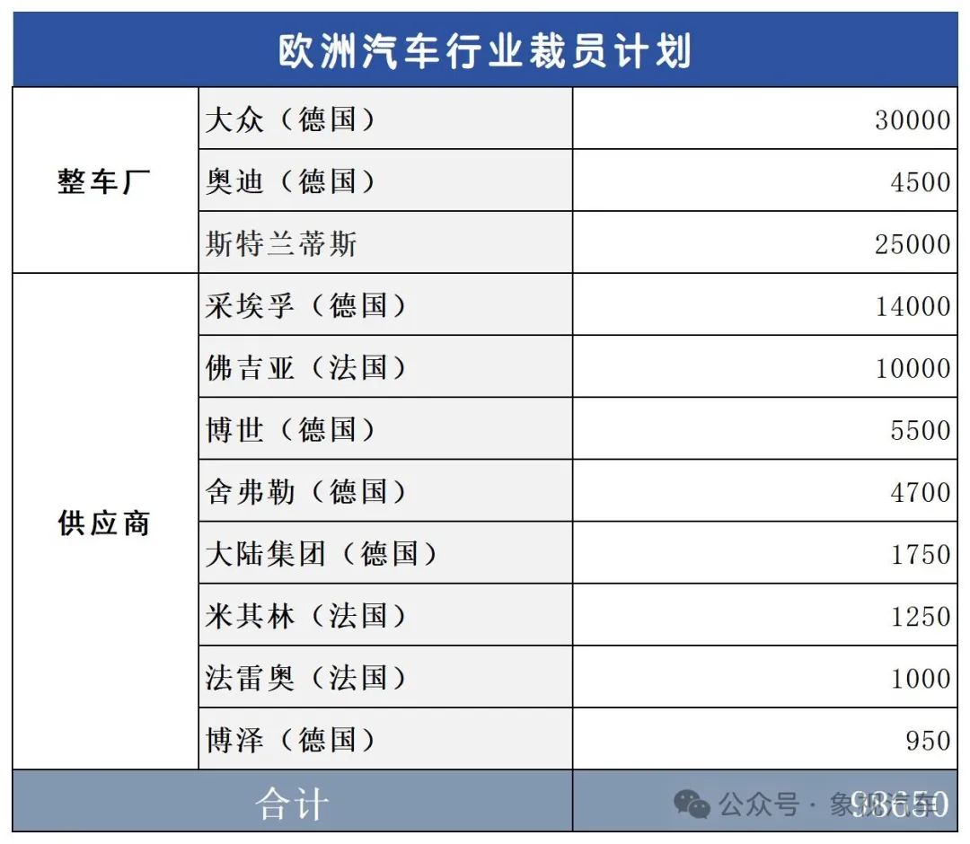The total number of layoffs mentioned above is close to 100,000, indicating that the European automobile industry is going through a difficult period.
