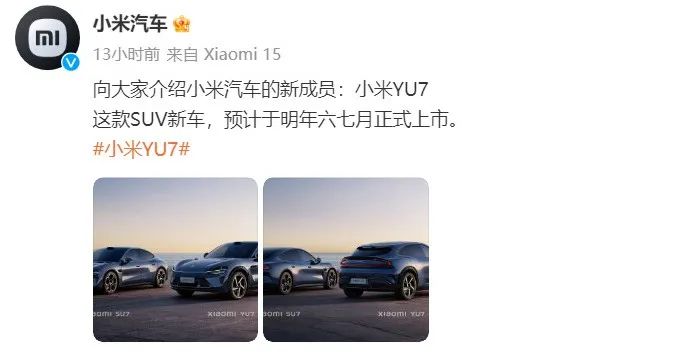 Recently, Xiaomi SUV's application information has been exposed, and the new car has been named 'YU7'. Meanwhile, Xiaomi Motors has officially announced that the all-new SUV model, Xiaomi YU7, is expected to officially hit the market in June or July next year.
