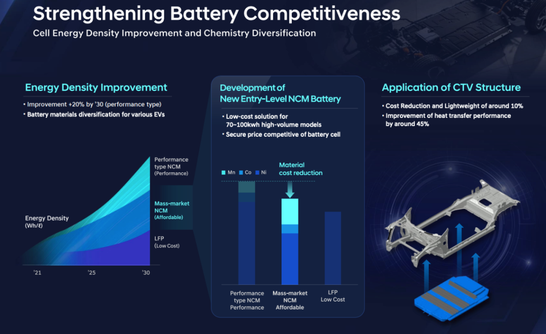 - Continuously increasing energy density through three material approaches: low-cost lithium iron phosphate (LFP), cost-effective nickel-cobalt-manganese (NCM) with balanced performance, and high-performance NCM. All three aim to significantly boost energy density post-2025. - Developing an entry-level NCM battery that substantially reduces nickel usage and increases manganese usage in high-demand batteries (70-100 kWh) to lower material costs and ensure cost competitiveness. - Adopting the Cell-to-Vehicle (CTV) integration architecture, which differs from CTC/CTB by mounting battery modules directly onto the vehicle structure. Hyundai claims this can reduce cost and weight by 10% and improve heat transfer efficiency by 45%.